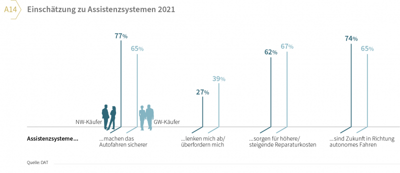 3) Positiver, aber auch kritischer Blick auf Assistenzsysteme: Seit Jahren steigt das Ausstattungsniveau in neuen Pkw, teils bedingt durch gesetzliche Vorgaben, aber auch getrieben durch technologische Entwicklungen. Die große Mehrheit der Autokäufer (72 Prozent der Neu-, 65 Prozent der Gebrauchtwagenkäufer) sieht in Assistenzsystemen mehr Sicherheit und ähnlich viele die Zukunft in Richtung autonomes Fahren. Allerdings sind über 60 Prozent davon überzeugt, dass damit die Reparaturkosten steigen. Nur gut ein Drittel befürchtet eine Überforderung oder Ablenkung während der Fahrt.