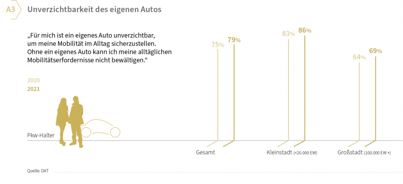 1) Unverzichtbarkeit des eigenen Automobils im Alltag: Befragt man alle Pkw-Halter in Deutschland nach der Bedeutung des Autos für ihr tägliches Leben, so bestätigten 79 Prozent, dass der eigene Pkw unverzichtbar sei. Ohne das eigene Auto könne man die alltäglichen Mobilitätserfordernisse nicht bewältigen. Dieser Wert lag im ersten Corona-Jahr mit 75 Prozent noch etwas niedriger (vgl. Grafik A3). Alle Grafiken sind in der Bildergalerie zu finden.