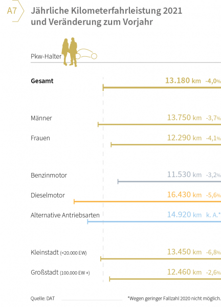 Durch die anhaltende Corona-Situation mit ihren Rahmenbedingungen (Kontaktbeschränkungen, Kurzarbeit, Homeoffice etc.) ist die Jahresfahrleistung der Pkw-Halter erneut leicht gesunken. 2021 lag der Durchschnitt bei 13.180 Kilometern, die jeder Autofahrer zurücklegte. Das ist ein Rückgang von 4,0 Prozent. Noch deutlicher mit minus 5,6 Prozent war die Verringerung bei Dieselfahrern, sie fuhren 2021 insgesamt 16.430 Kilometer (vgl. Grafik A7).