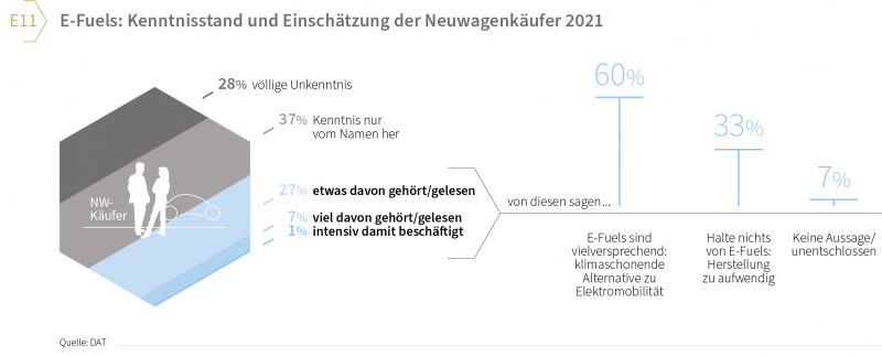 3) E-Fuels als Alternative? Von allen Neuwagenkäufern haben sich 35 Prozent bereits mit synthetischen Kraftstoffen beschäftigt. Von dieser Teilgruppe bestätigten 60 Prozent die Aussage „E-Fuels sind vielversprechend, sie sind eine klimaschonende Alternative zur Elektromobilität“ (vgl. Grafik E11).