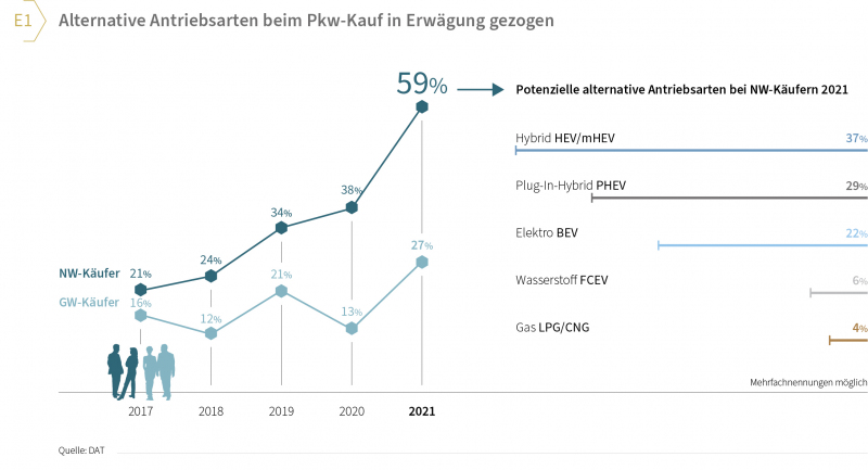 1) Alternative Antriebsarten im Kommen: Besonders die Neuwagenkäufer haben 2021 im Rahmen ihres Kaufprozesses die Anschaffung eines Pkw mit alternativen Antrieben in Erwägung gezogen (59 Prozent). Gegenüber moderaten Zuwächsen in den vergangenen Jahren war das nun ein deutlicher Sprung von plus 21 Prozentpunkten zu 2020 (vgl. Grafik E1).