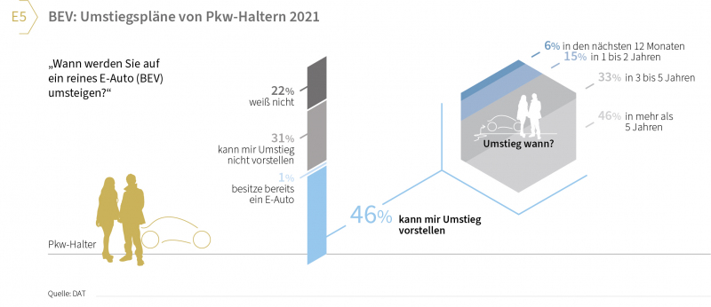 Knapp die Hälfte sämtlicher Pkw-Halter (46 Prozent) gab an, sie könnten sich vorstellen, auf ein rein elektrisches Fahrzeug umzusteigen. Der Rest kann es sich entweder gar nicht vorstellen (31 Prozent) oder ist noch unsicher (22 Prozent).