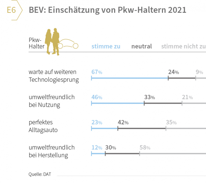 2) Sicht auf batterieelektrische Fahrzeuge eher nüchtern: Die Einschätzung der Pkw-Halter zu batterieelektrischen Fahrzeugen (BEV) spiegelt deren Akzeptanz in der Gesellschaft wider. Relevant ist in diesem Zusammenhang, dass die große Mehrheit der Befragten (67 Prozent) angab, zunächst noch abwarten zu wollen, bis ein weiterer Technologiesprung erfolgt. Knapp die Hälfte (46 Prozent) bestätigte, BEV seien zwar umweltfreundlich bei der Nutzung, aber nur 12 Prozent sahen sie als umweltfreundlich bei der Herstellung (vgl. Grafik E6).