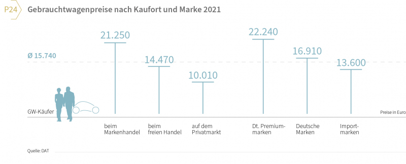 Auch die Gebrauchtwagenpreise erreichten ein Allzeithoch und lagen bei 15.740 Euro. Das ist eine Steigerung von 1.010 Euro oder 7 Prozent gegenüber dem Vorjahr. Ein besonderer Grund war die außergewöhnliche Knappheit beim Angebot auf dem Gebrauchtwagenmarkt. Beim Markenhandel bezahlten die Käufer 21.250 Euro (plus 14 Prozent), auf dem Privatmarkt 10.010 Euro (plus 3 Prozent, vgl. Grafik P24).