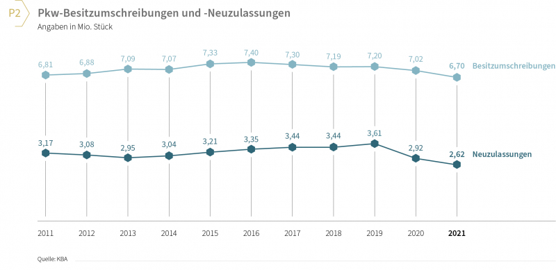 1) Nachfrage höher als das Angebot, Zahlen auf Neu- und Gebrauchtwagenmarkt rückläufig: Gegenüber dem Vorjahr wurden laut Kraftfahrt-Bundesamt (KBA) 10,1 Prozent weniger Neuwagen zugelassen, und auch der Gebrauchtwagenmarkt hatte mit einem Rückgang von 4,5 Prozent zu kämpfen. Dies lag vor allem an Lieferschwierigkeiten im Neuwagenbereich und fehlendem Angebot bei Gebrauchtwagen. Nach den starken letzten Jahren war 2021 das zweite negative Jahr in Folge (vgl. Grafik P2).