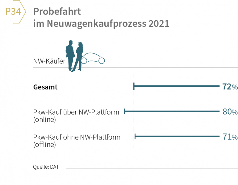 2) Probefahrt ist bedeutend: Die steigende Komplexität der Fahrzeuge führte dazu, dass 2021 mehr Informationsquellen als bisher konsultiert wurden. Neben der steigenden Nutzung von Onlinequellen war die wichtigste Offlinequelle aus Sicht aller Autokäufer die Probefahrt. Insgesamt wurde trotz anhaltender Pandemie von 72 Prozent aller privaten Neuwagenkäufer eine Probefahrt vor dem Kauf durchgeführt. Bei Onlinekäufern (Kauf über eine so genannte Neuwagenplattform) lag die Probefahrtquote mit 80 Prozent noch höher (vgl. Grafik P34).
