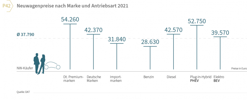 4) Hohe Anschaffungspreise: Wer sich 2021 einen Neuwagen kaufte, der bezahlte im Schnitt mit 37.790 Euro so viel wie noch nie. Ein immer höheres Ausstattungsniveau, deutlich mehr SUV-Modelle aber auch alternative Antriebsarten begründen unter anderem die seit Jahren steigenden Preise. Unterschiede gab es je nach Markengruppen, zum Beispiel wurden für Neuwagen deutscher Premiummarken 54.260 Euro bezahlt, für Neuwagen der Importfabrikate 31.840 Euro (vgl. Grafik P42).