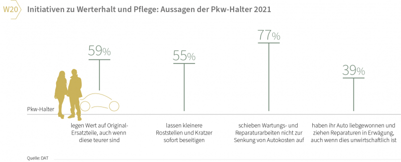 2) Die Wertschätzung des eigenen Automobils war weiterhin groß: Diese Aussage spiegelt sich im Umgang mit dem eigenen Pkw, mit dessen Pflege und dem damit verbundenen Werterhalt wider. So lassen 55 Prozent kleinere Roststellen und Kratzer sofort beseitigen, 77 Prozent haben anstehende Wartungs- und Reparaturarbeiten nicht aufgeschoben, und 39 Prozent haben ihr Auto so liebgewonnen, dass sie auch Reparaturen in Erwägung ziehen, selbst wenn diese unwirtschaftlich wären (vgl. Grafik W20).
