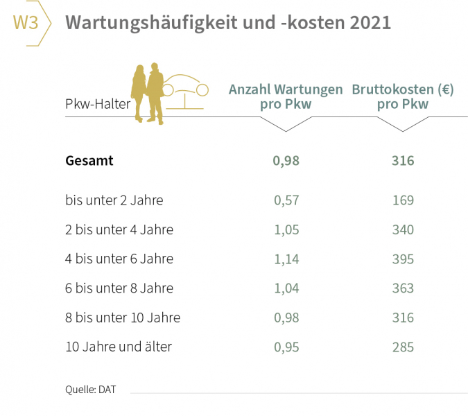 3) Werkstätten bleiben unverzichtbar: Die markengebundenen und freien Werkstätten spielen eine elementare Rolle. Mit ihren Wartungs- und Reparaturarbeiten, Räderwechseln, Karosseriearbeiten und ihrer Beratung rund um Mobilität garantieren sie allen Pkw-Haltern die zuverlässige und sichere Nutzung ihrer Fahrzeuge. So wurden zum Beispiel auf ähnlich hohem Niveau wie im Vorjahr Wartungsarbeiten an Pkw durchgeführt (0,98 Arbeiten pro Pkw; vgl. Grafik W3). Allein für diese hat jeder Pkw-Halter 2021 im Schnitt 316 Euro investiert.