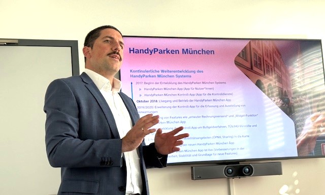 Abb. 1 (Aufmacherbild): Ilkkan Karatas, Mitarbeiter des Ressorts Mobilität der Stadtwerke München, informierte die Teilnehmer des VdM Regionalkreises Bayern über den Erfolgsweg der HandyParken München App.