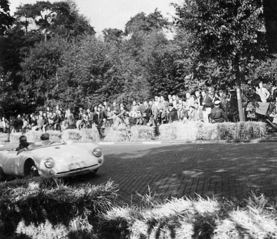 Abb. 1 (Aufmacherbild): Eilenriede: Erste Motorsportaufnahmen 1955 vom Rennen in der hannoverschen Eilenriede. Man beachte die Zuschauer direkt an der Rennstrecke