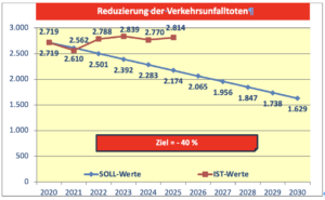 Die Bundesregierung hatte sich noch unter der Ägide des Ministers Andreas Scheuer (CSU) (vgl. Grafik untenstehend) vor allen anderen Staaten der EU dazu verpflichtet, bis zum Jahr 2030 im Vergleich zum Ausgangsjahr der letzten Dekade, dem Jahr 2020, alle möglichen Anstrengungen zu unternehmen, die Anzahl der Verkehrsunfalltoten um 40 Prozent zu reduzieren (vgl. Grafik; Quelle: Prof. Dieter Müller). Für das Jahr 2025 hätten damit 2.174 Verkehrsunfalltote nicht überschritten werden dürfen. Deutschland hat diese Zahl um 640 getötete Menschen verfehlt und es ist nicht ansatzweise sichtbar, dass sich dieser Zustand in den nächsten Jahren verbessern wird.
